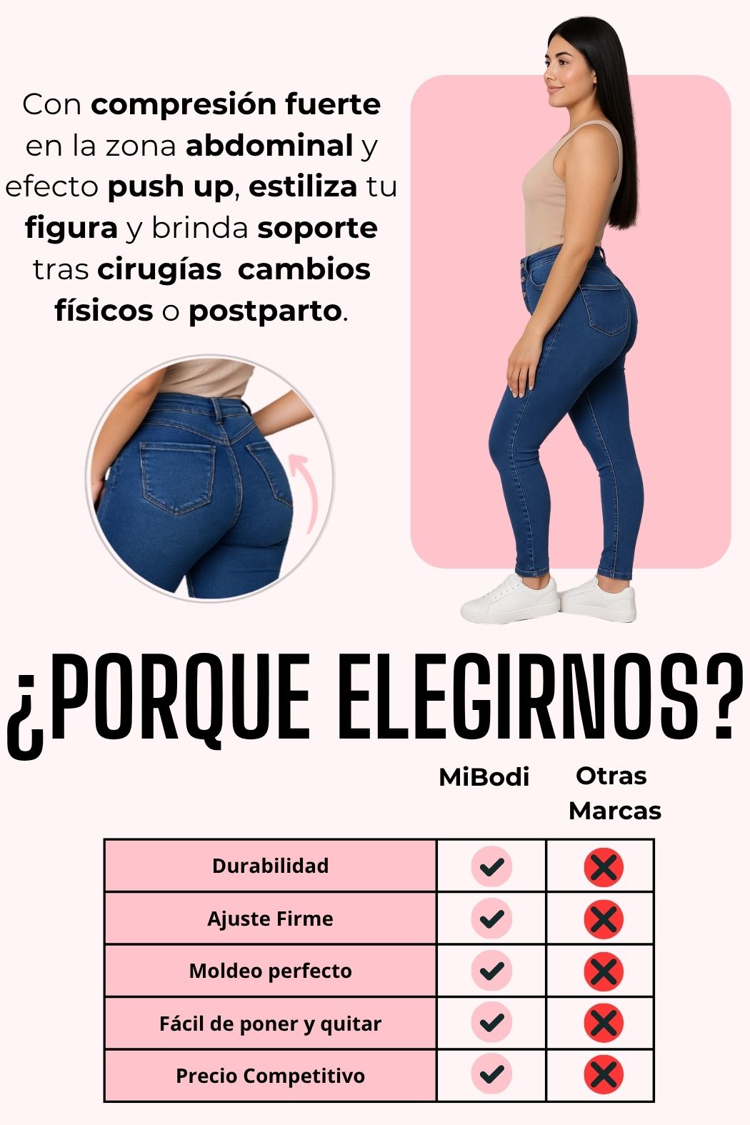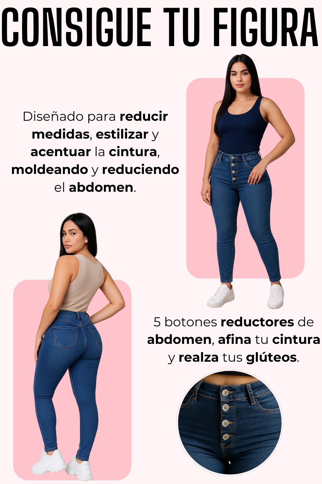 Nuestros jeans están diseñados para realzar tu forma natural y definir tu cintura y abdomen, con efecto levanta cola para una silueta más firme y estilizada.